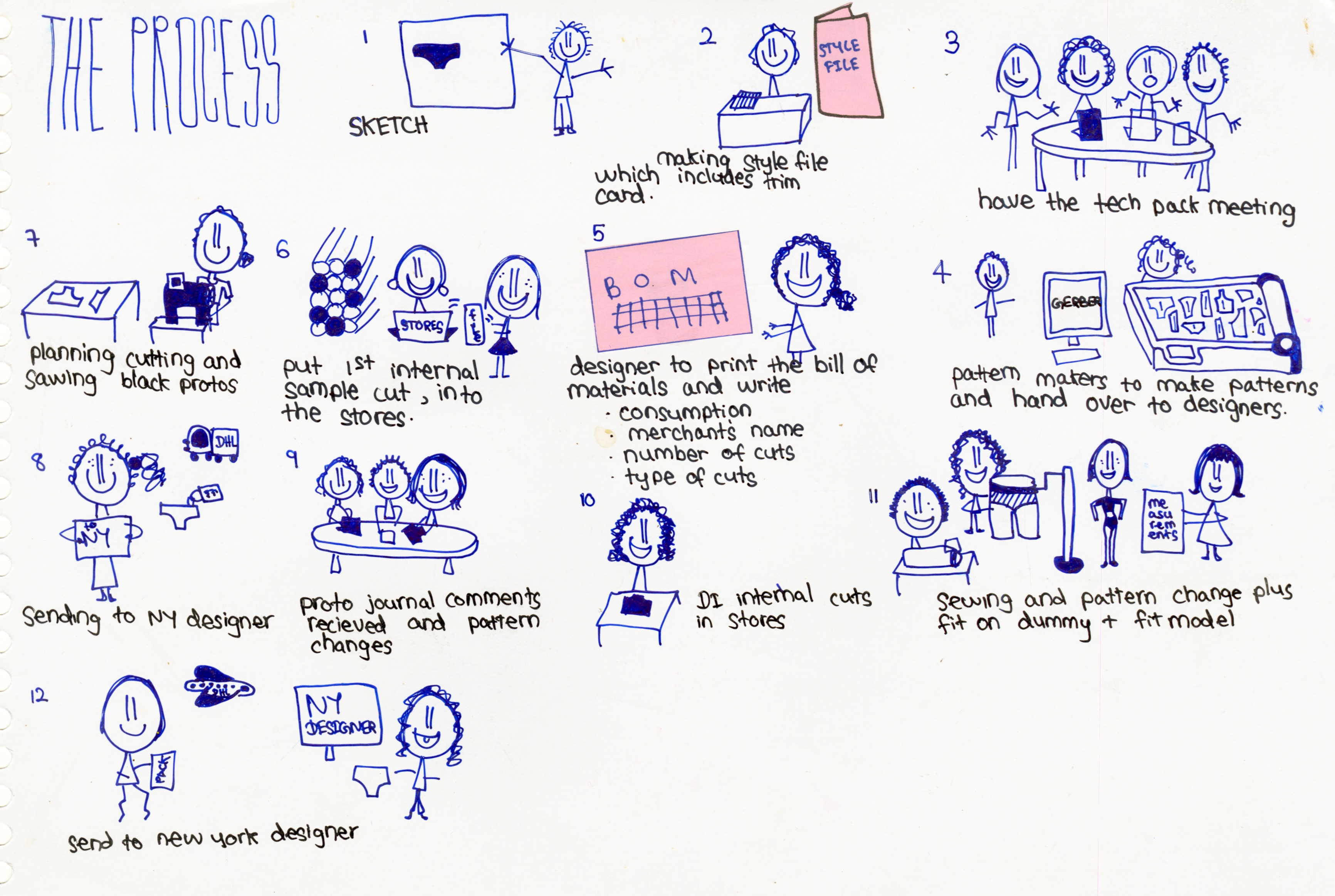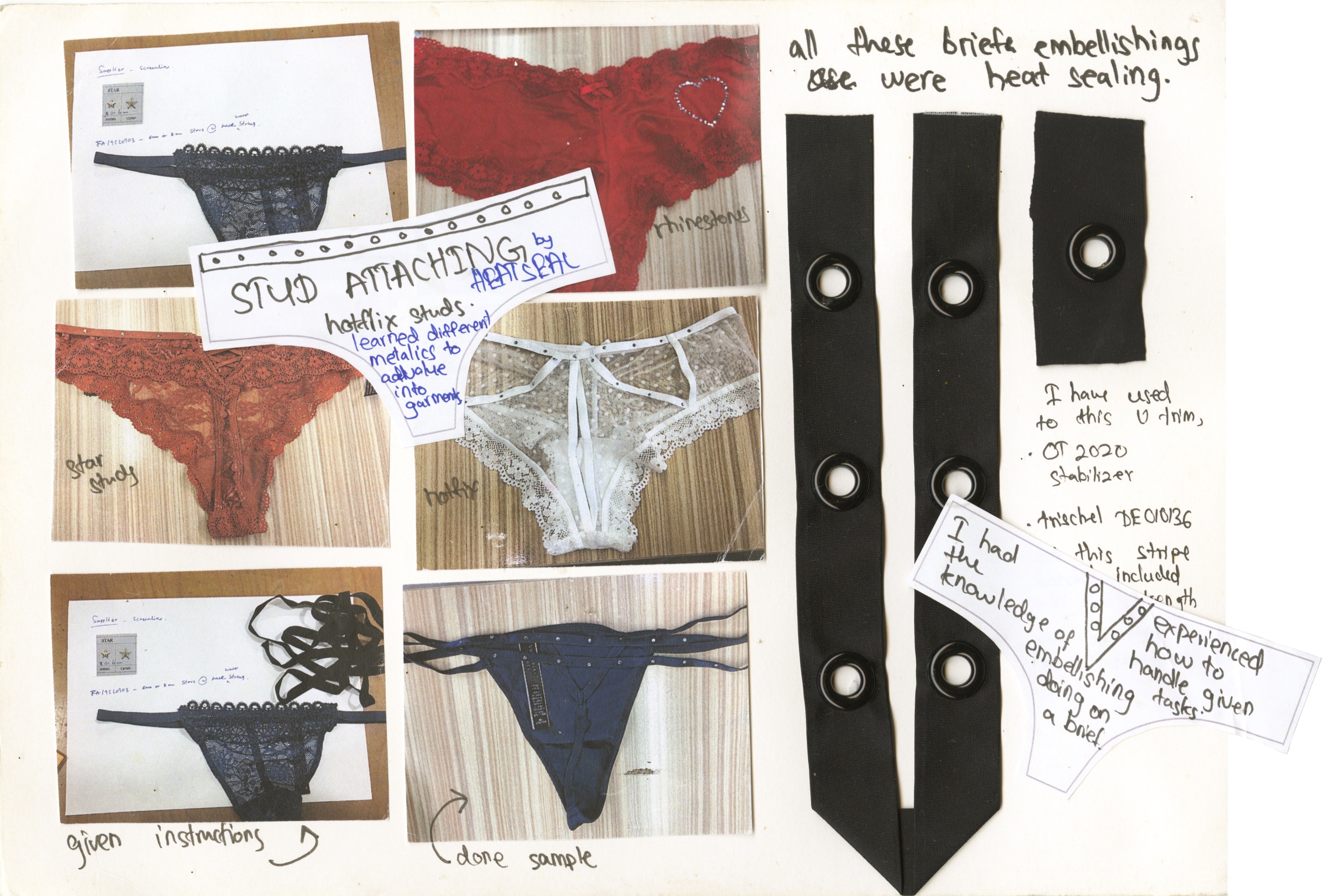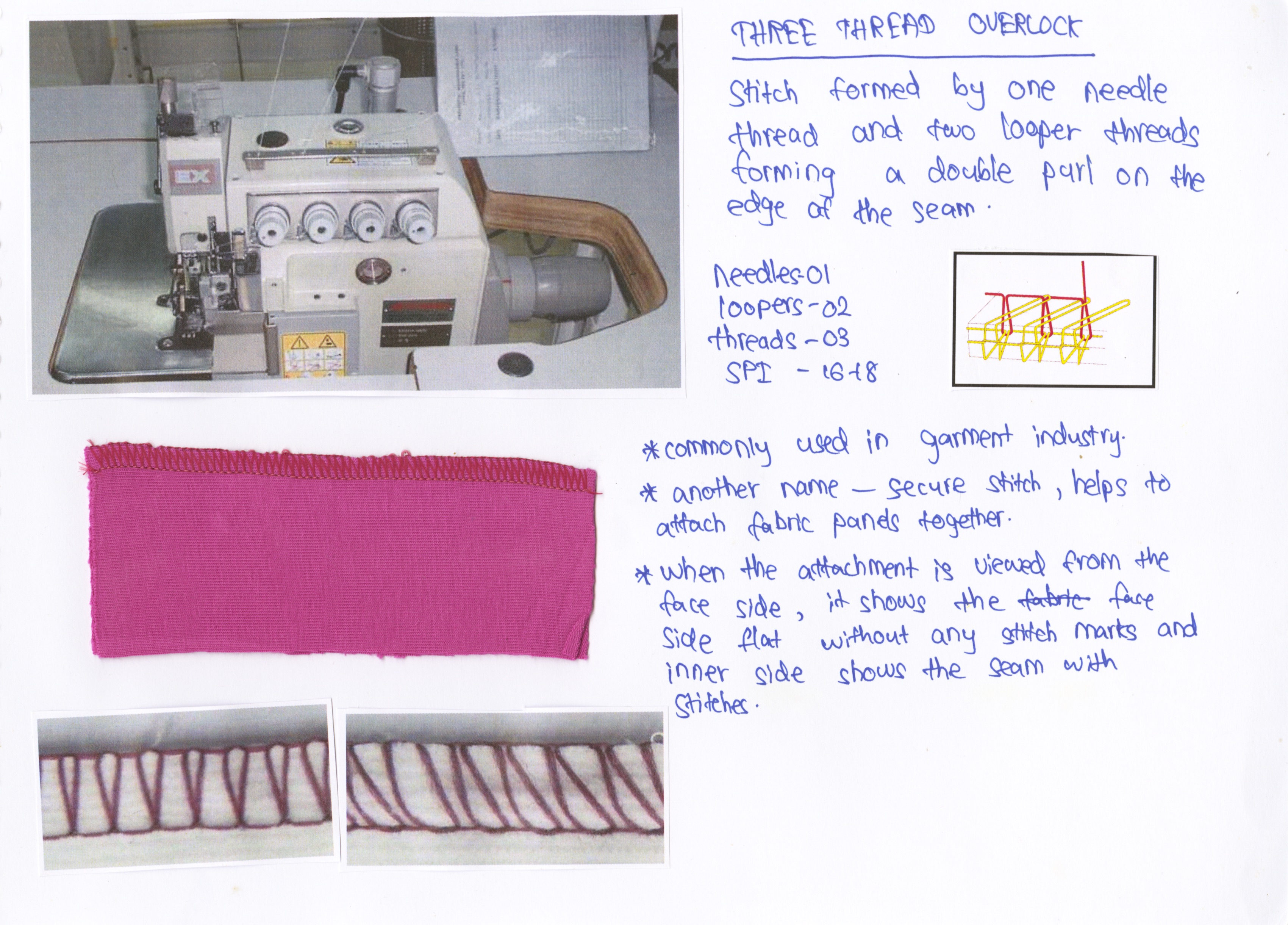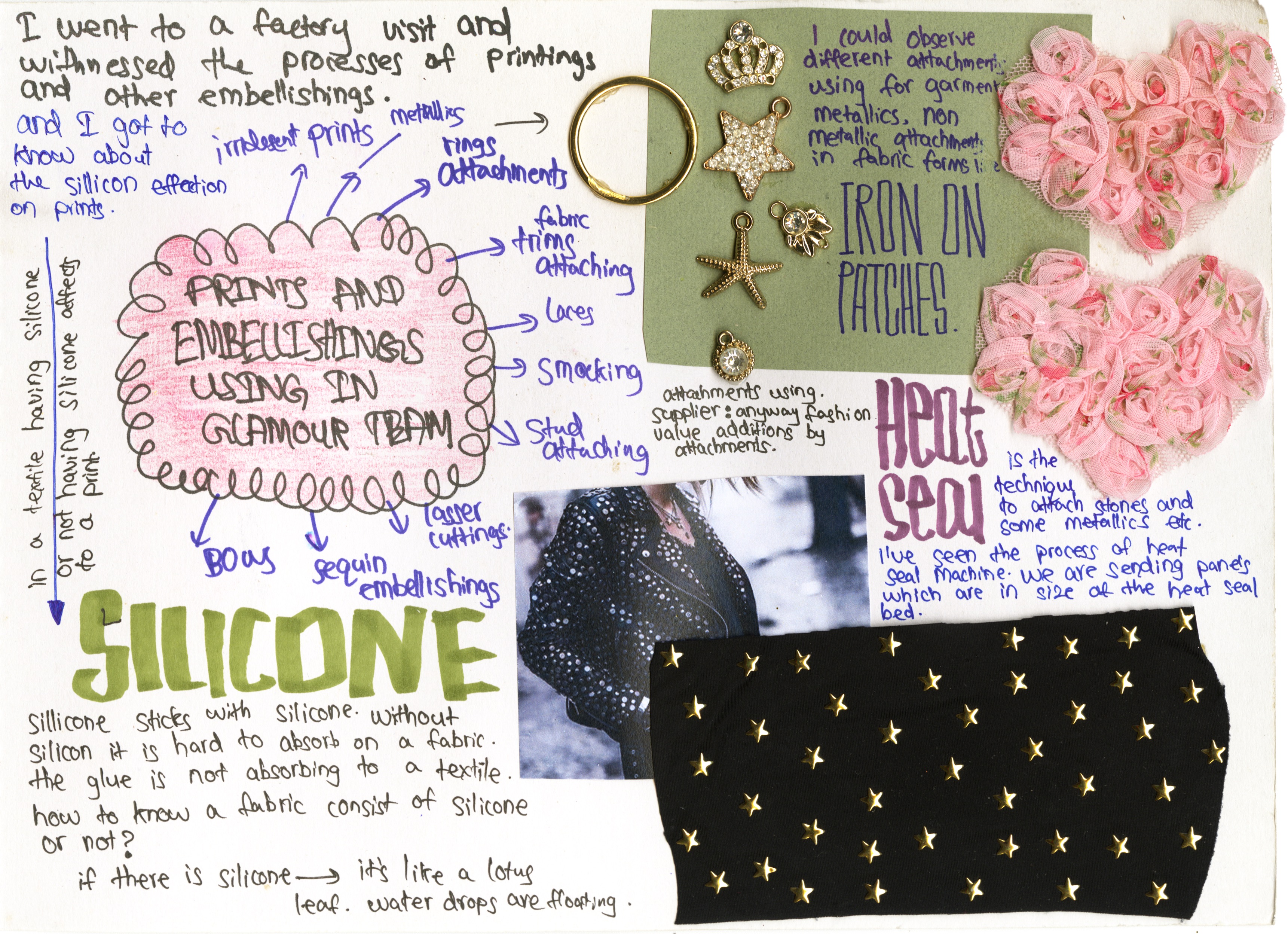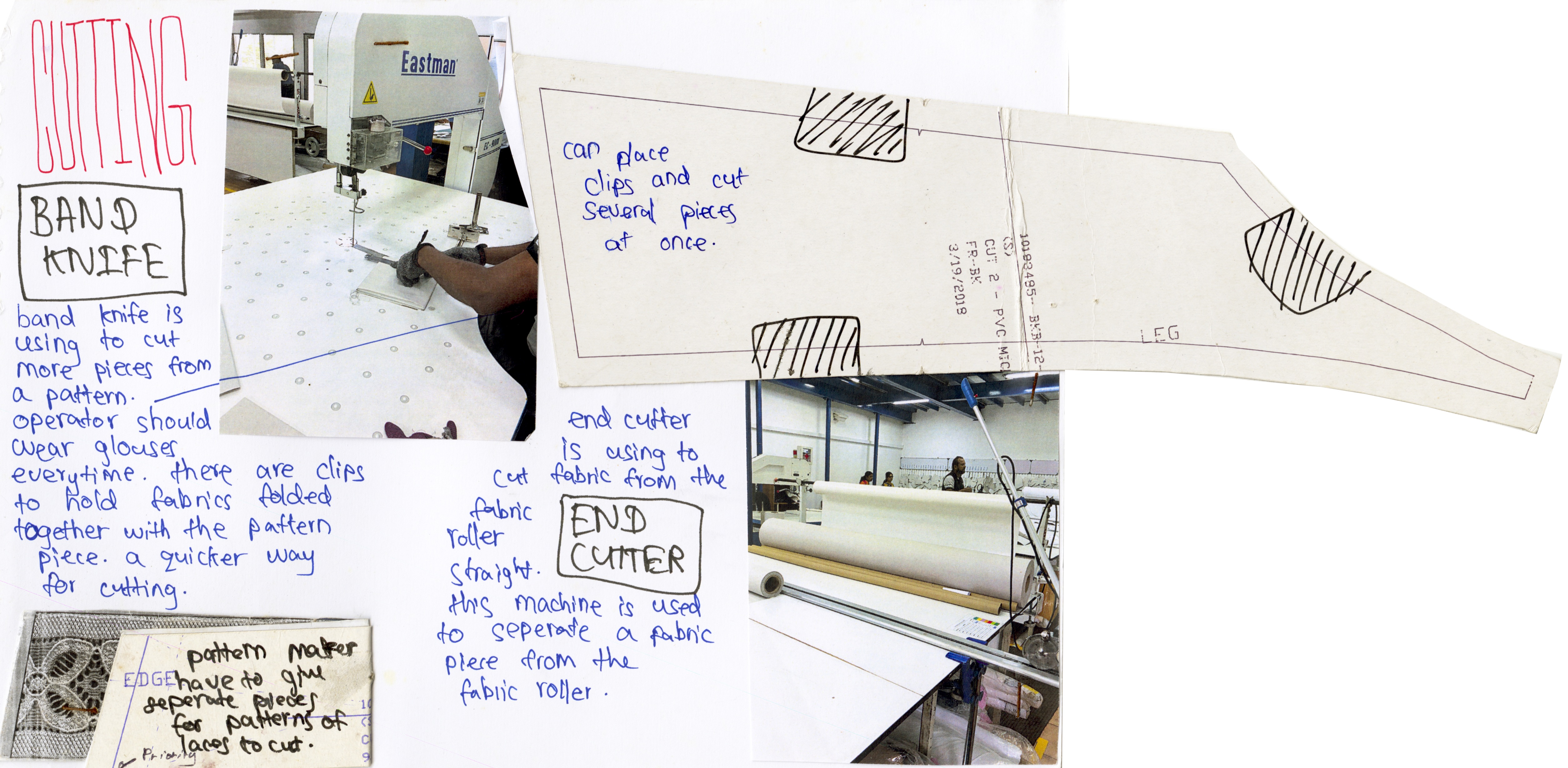 notes of the work of silhouette, fit, fabrication, construction, sewing techniques, machineries and trims